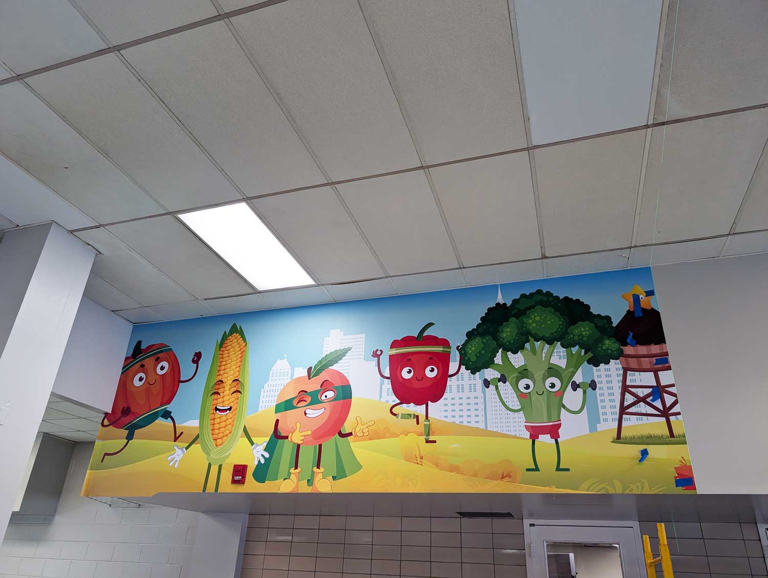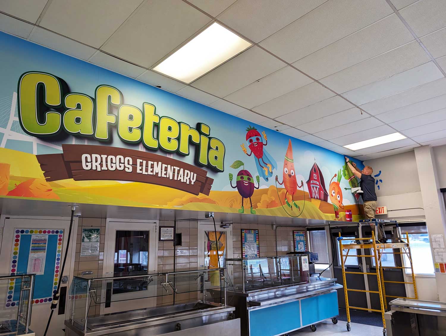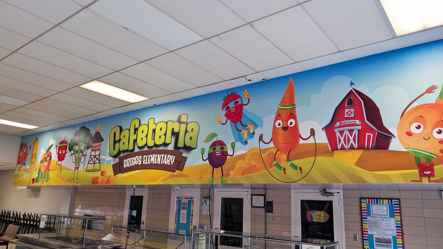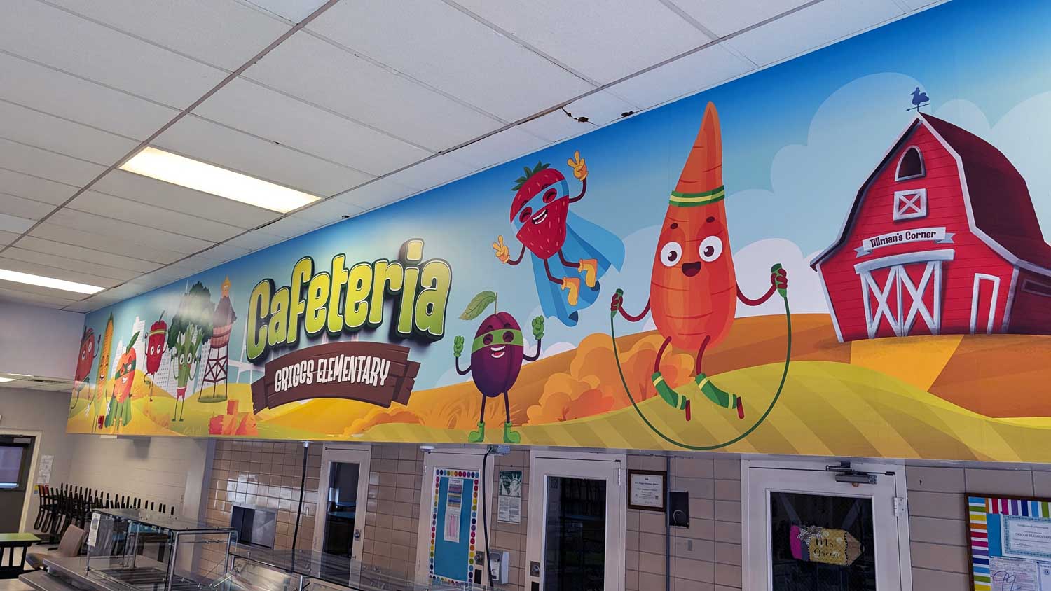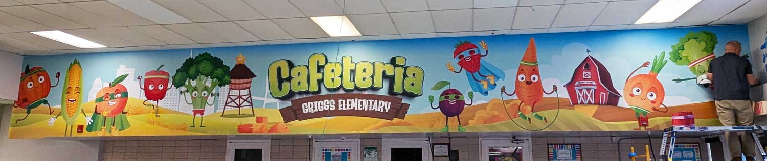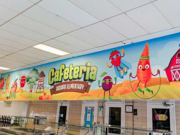 We brought energy and fun to Griggs Elementary School’s cafeteria with a vibrant wall wrap featuring animated fruits and vegetables in a playful farm setting. Designed to encourage healthy eating habits, this colorful mural transforms the dining space into a cheerful, engaging environment that kids love. The large-scale design stretches across the top of the serving area, making a bold visual statement that supports both nutrition education and school spirit.