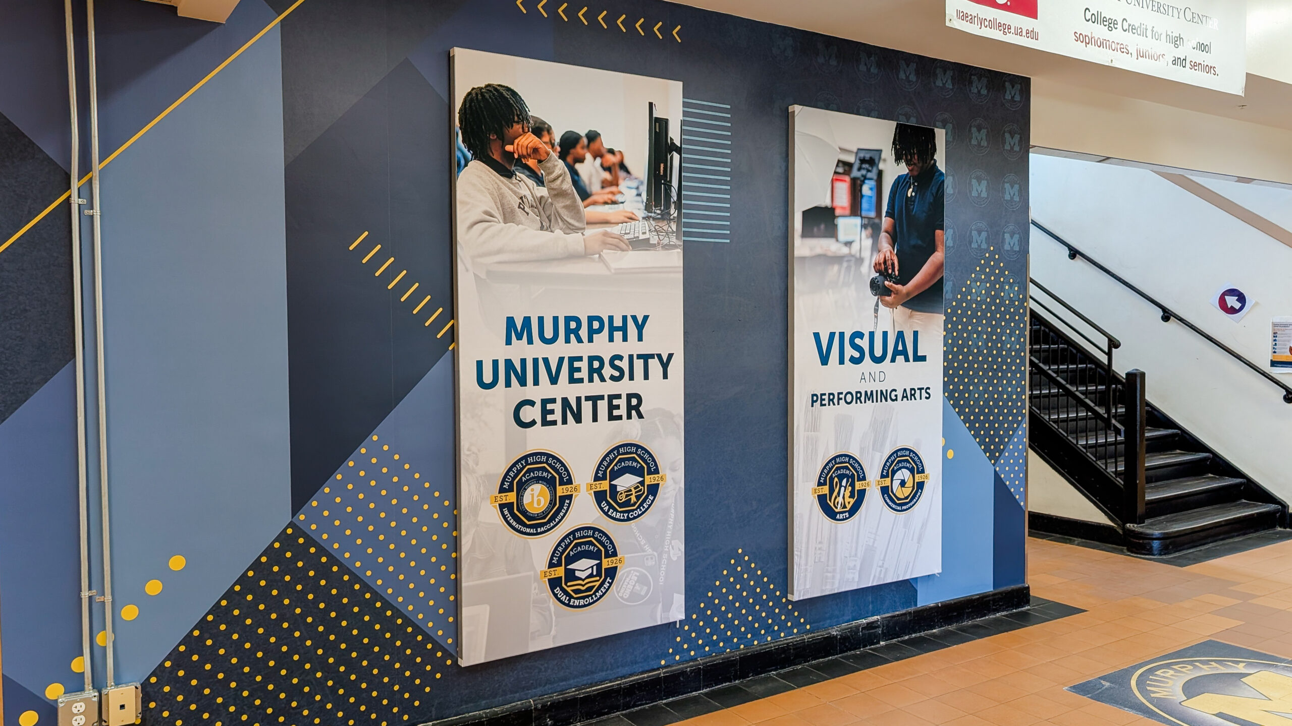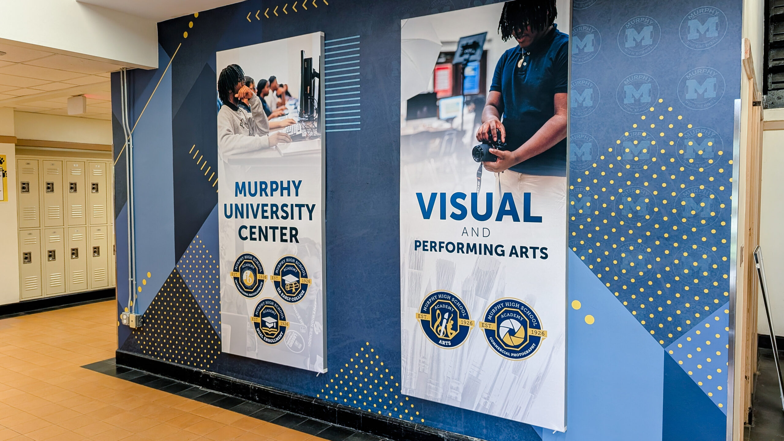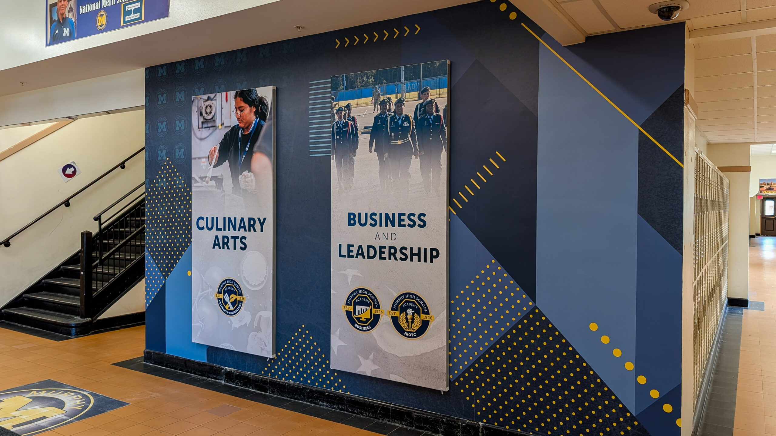 Each entrance now features dimensional panels highlighting Murphy High School’s academies, including Visual & Performing Arts, Culinary Arts, Business & Leadership, and the Murphy University Center. The result is a space that feels intentional, inspiring, and future-focused—setting the tone the moment students walk through the doors.