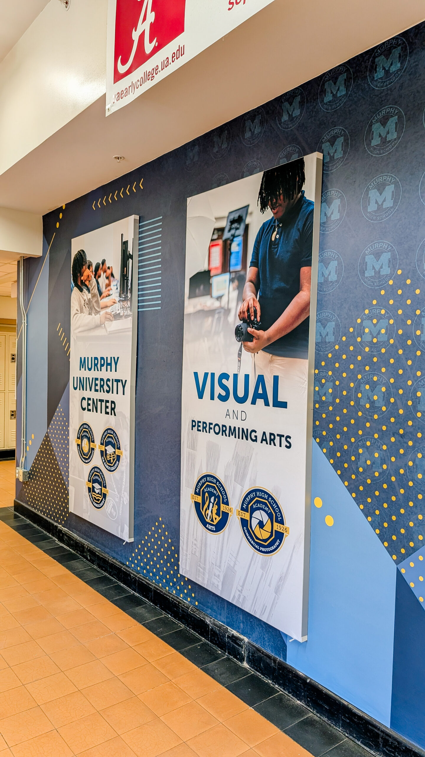Murphy High School in Mobile, Alabama wanted to completely transform the two main interior entrance walls that greet students, staff, and visitors every day. What began as a dated, worn entry space became a bold, modern showcase of Murphy’s academic pathways and school pride.