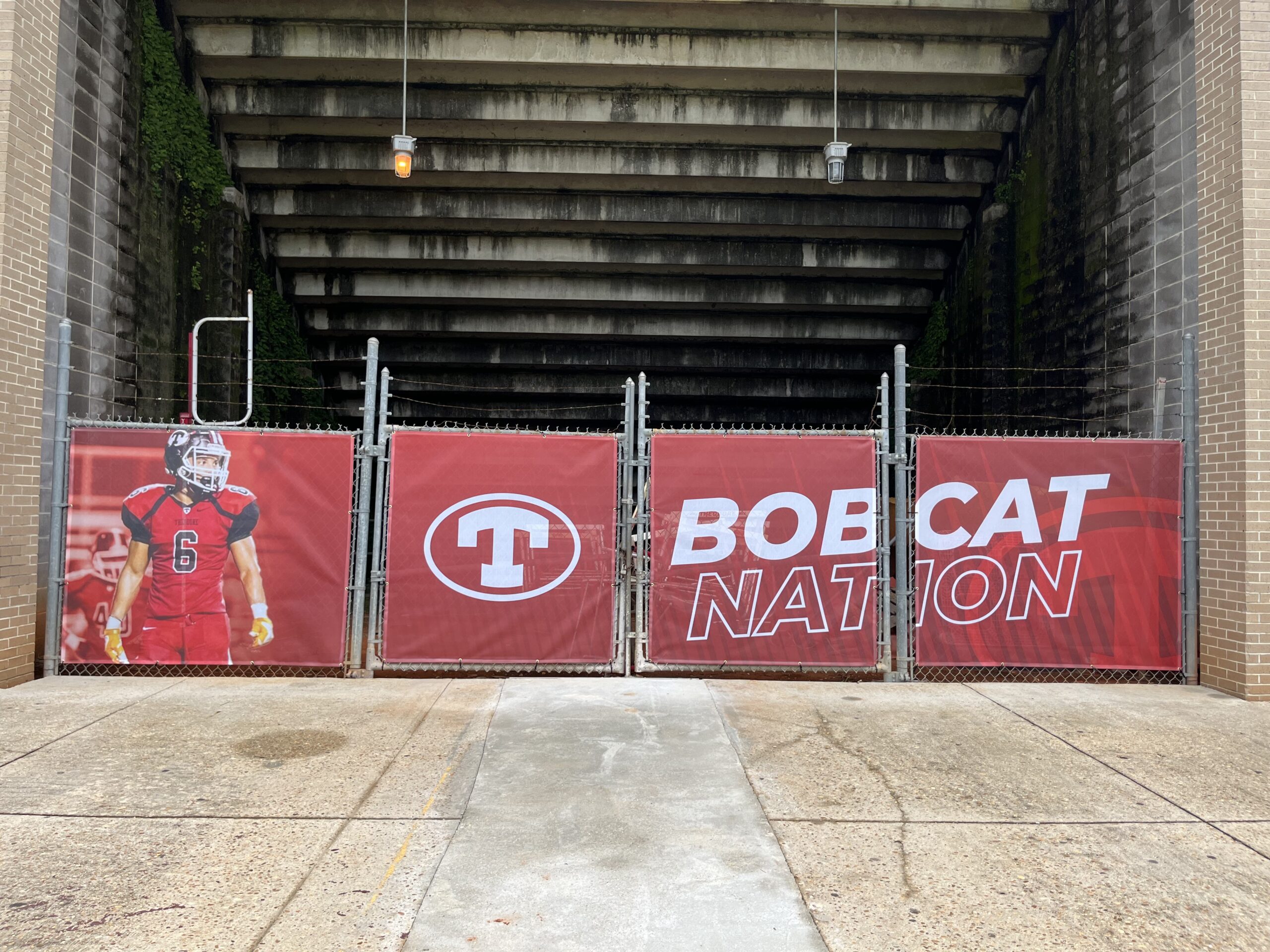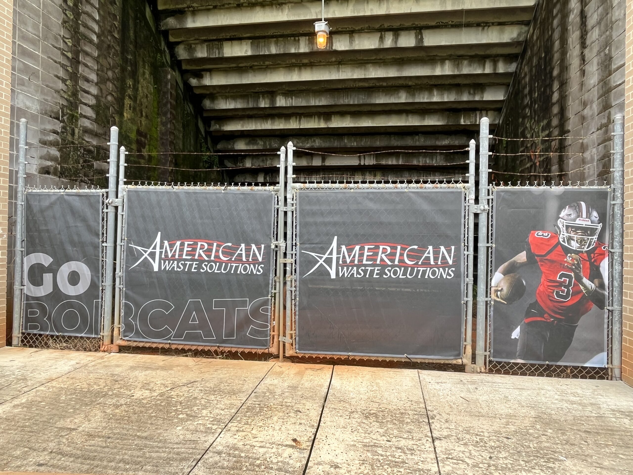 Custom vinyl bleacher bay banners installed under stadium bleachers at Theodore High School featuring Bobcat Nation graphics.