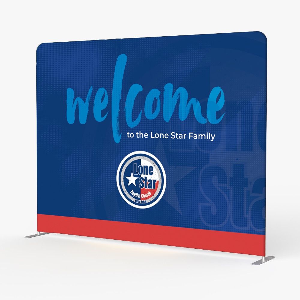 Custom welcome tension fabric backdrop designed for Lone Star Baptist Church to create a professional first impression for guests and visitors.
