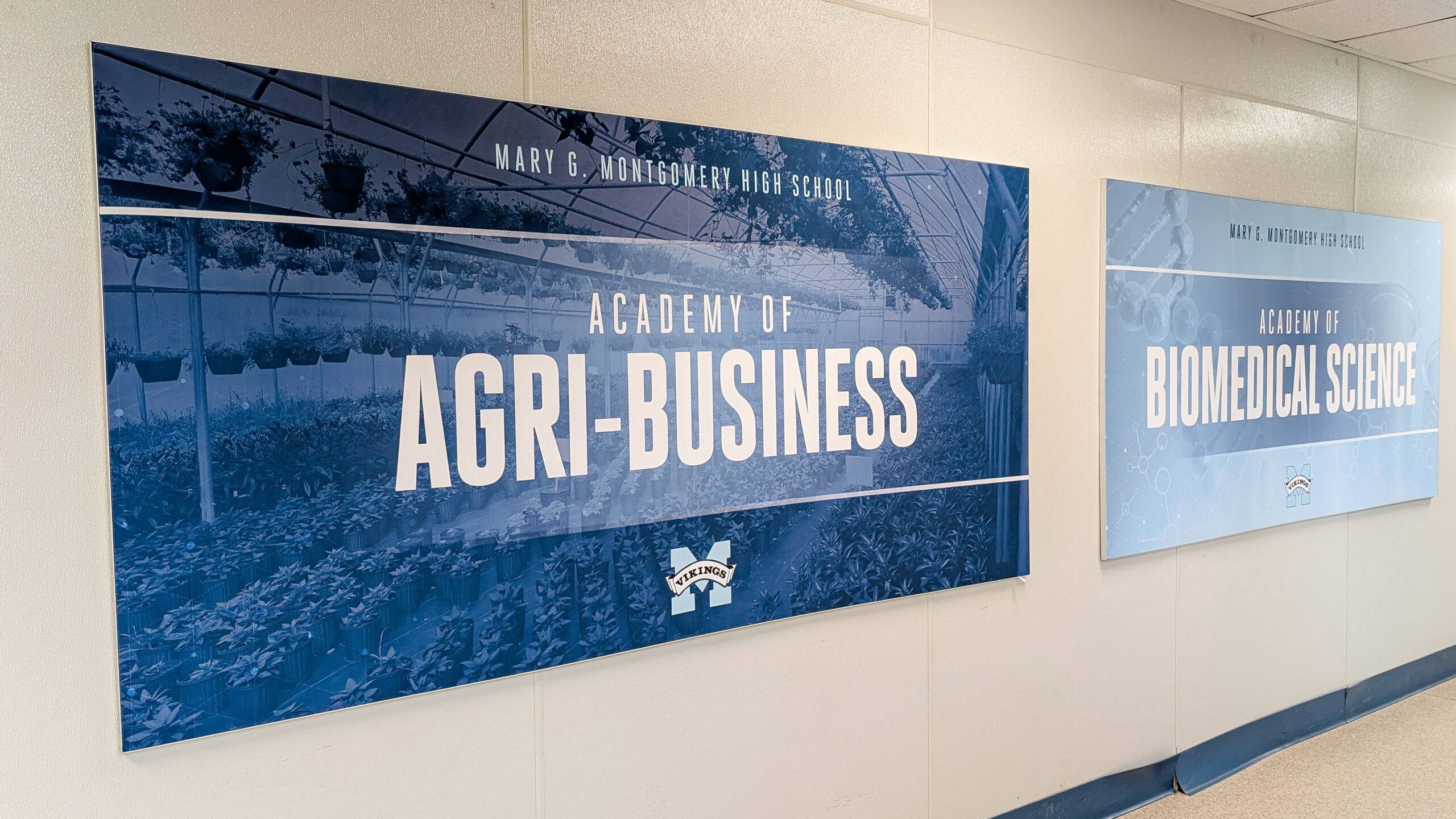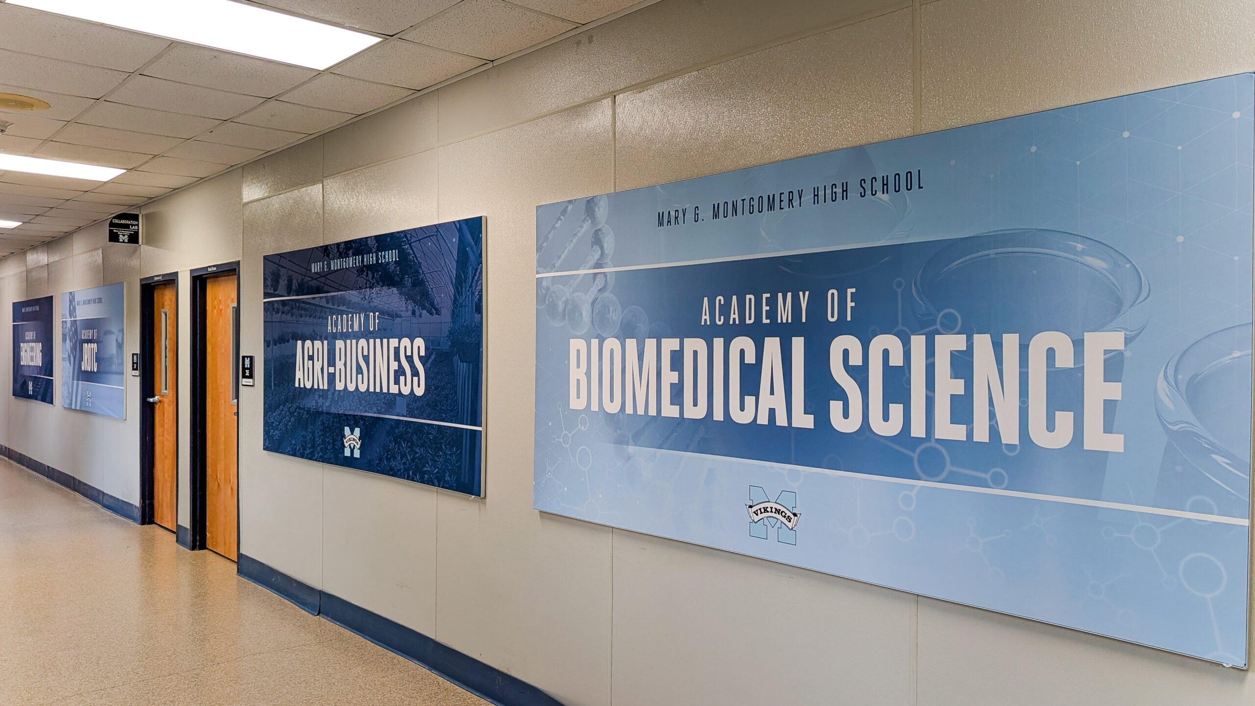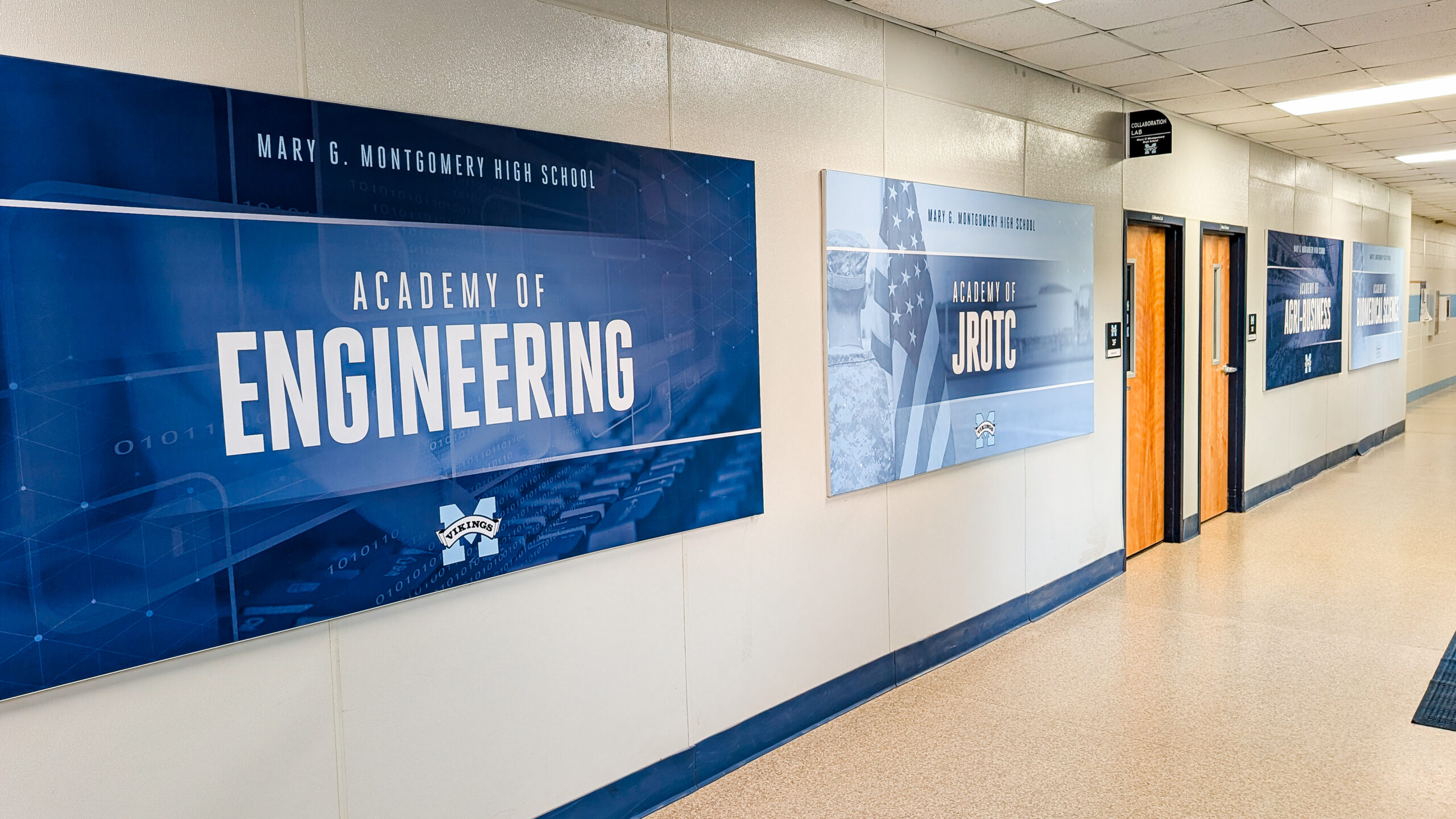 Hallway view showing multiple academy SEG wall graphics at Mary G. Montgomery High School
