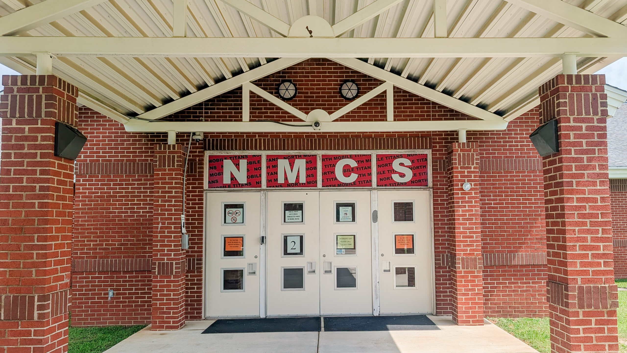 Custom window perforated graphics spelling “NMCS” above the front entrance doors at North Mobile County School in Mobile, Alabama, featuring bold white letters over a red Titan-themed background.