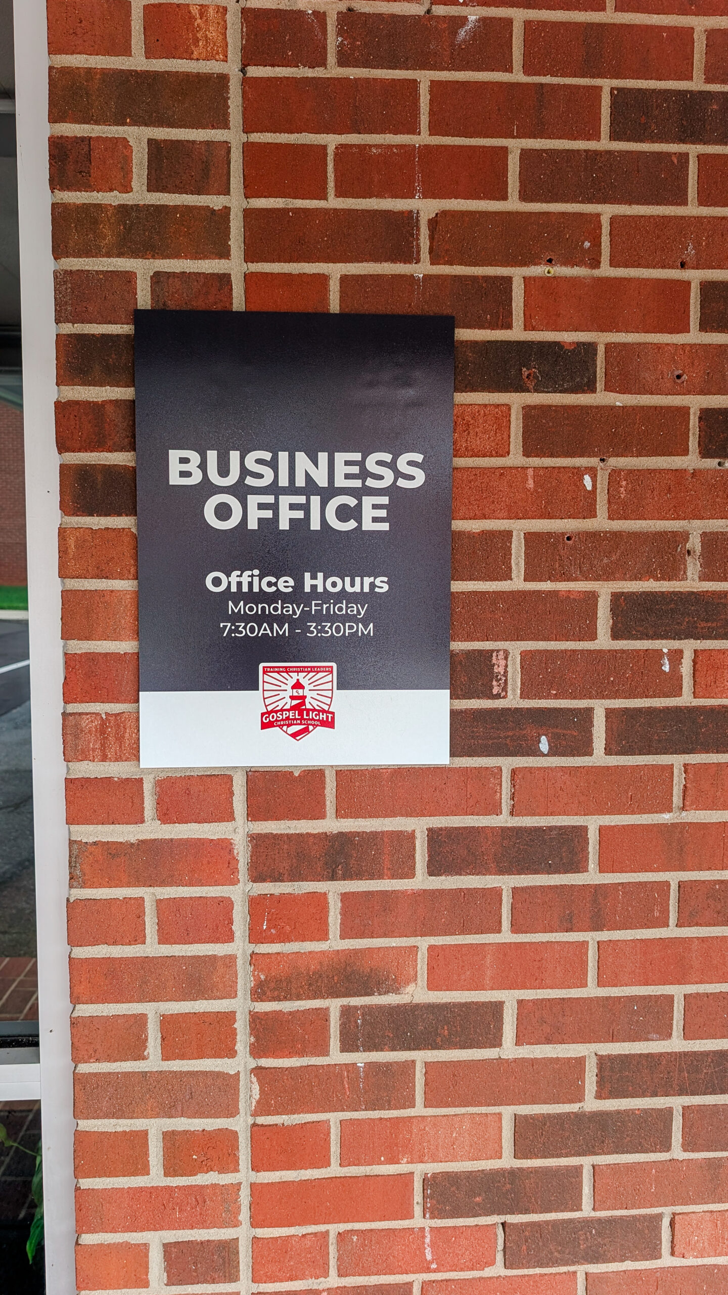 Wall-mounted ACM sign identifying student affairs and business offices at Gospel Light Christian School.