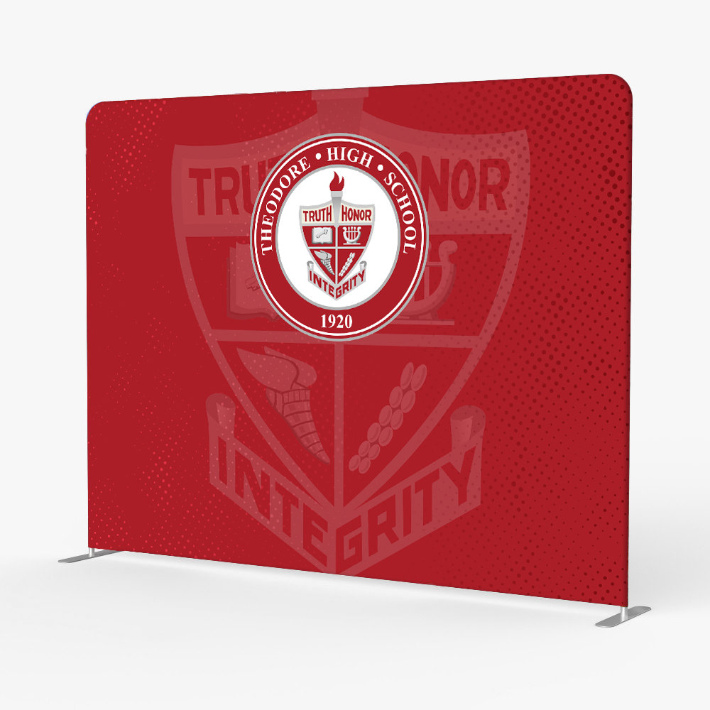 Compel Graphics & Printing designed and produced this custom branded backdrop for Theodore High School featuring their official school crest and institutional colors. This large format tension fabric display was created to provide a professional background for school recognition events, academic ceremonies, and media opportunities.