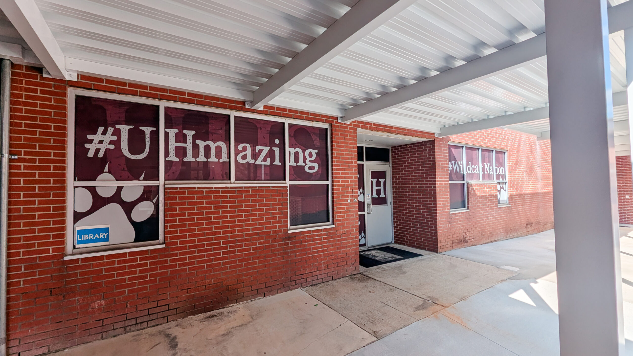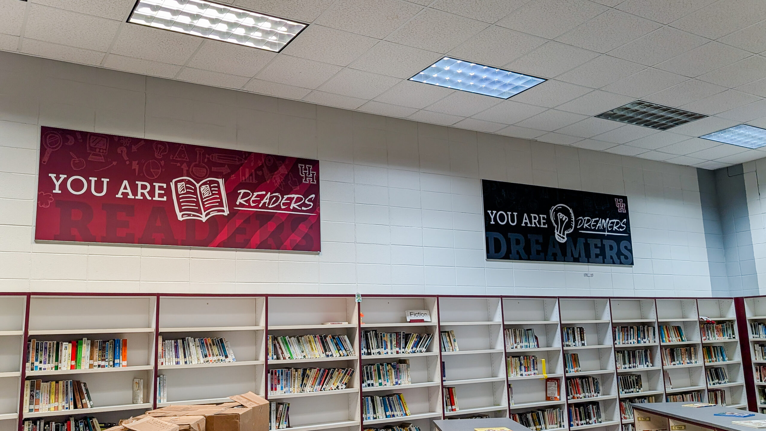 Phase one focused on front entrance and library window perf graphics, creating visibility, school pride, and privacy without sacrificing natural light.